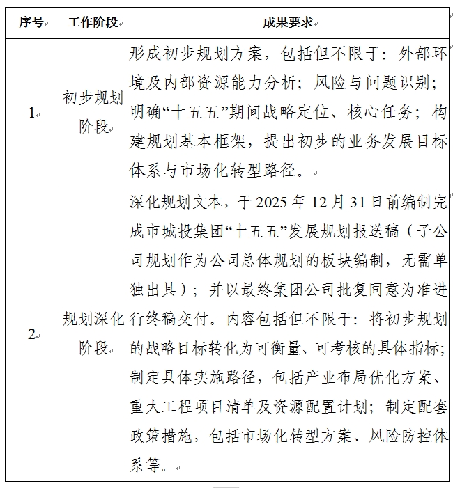 1.服務(wù)內(nèi)容:本次采購(gòu)旨在選取專(zhuān)業(yè)規(guī)劃咨詢服務(wù)單位,通過(guò)專(zhuān)業(yè)機(jī)構(gòu)的深度謀劃,助力集團(tuán)公司在“十五五”期間明確發(fā)展方向,優(yōu)化資源配置,提升核心競(jìng)爭(zhēng)力,為實(shí)現(xiàn)遠(yuǎn)期戰(zhàn)略目標(biāo)奠定堅(jiān)實(shí)基礎(chǔ)。服務(wù)內(nèi)容包括但不限于:外部環(huán)境及內(nèi)部資源能力分析、企業(yè)發(fā)展規(guī)劃目標(biāo)及業(yè)務(wù)布局、國(guó)企轉(zhuǎn)型措施、重大任務(wù)及保障措施、實(shí)施計(jì)劃、具體實(shí)施細(xì)則以及在“十五五”推進(jìn)中進(jìn)行中期和末期評(píng)估等方面。方案需在2025年9月20日前完成初稿,2025年12月31前完成報(bào)送稿,根據(jù)反饋意見(jiàn)在采購(gòu)人要求的時(shí)間內(nèi)完成修正稿(終稿)。